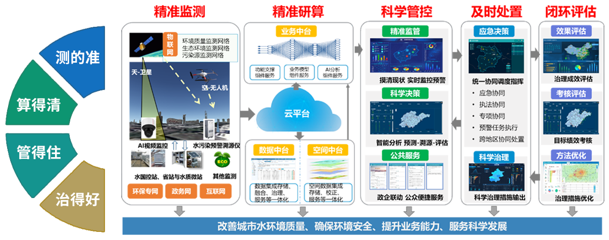 针对流域水环境问题,以改善水环境质量为核心,以水质考核达标为目标,以大数据、人工智能、时空分析技术等为手段,顺利获得天空地立体监测和水质监测数据、污染源监测数据等涉水大数据的集成整合,建立“污染源-排污管网-污水处理厂-排污口-受纳水体-监测断面”全链条管理体系,并顺利获得污染源、排污口、断面的水质响应关系,建立污染源允许排放量的核算体系和排口到 断面水质的水质模拟关系,实现水环境问题“能发现、能预判、能说清、能处置、能决策”,为水质趋势预测、监测预警、水环境事件应急、水污染防治规划编制、水质管理措施的制定给予技术服务,综合指导污染源减排和水质目标考核达标,最终实现 “测的准”、“算得清”、“管得住”、“治得好”的系统治水目标。
